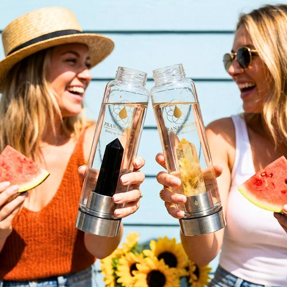 A Prana Drops kulacsok BPA-mentes, hőálló üvegből készülnek, valódi kristállyal – nem csak szépek, hanem egészséges alternatívái a tömeggyártott műanyag palackoknak.